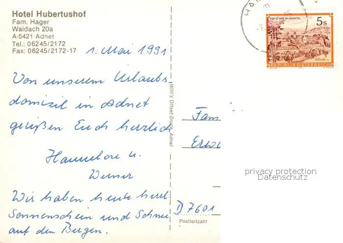 Adnet Hotel Hubertushof Swimming Pool Adnet postalisch gelaufen 1991 Erhaltung siehe scans [FriedD77] Frierer