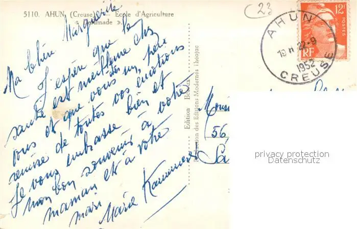 Ahun Ecole d'Agriculture Defumade Ahun postalisch gelaufen 1952 Erhaltung siehe scans [FriedD77] Frierer