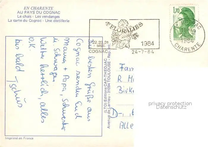 Alkohol Cognac Chais Vendanges Distillerie Alkohol postalisch gelaufen 1984 Erhaltung siehe scans [PaolaD17] PaolPID1