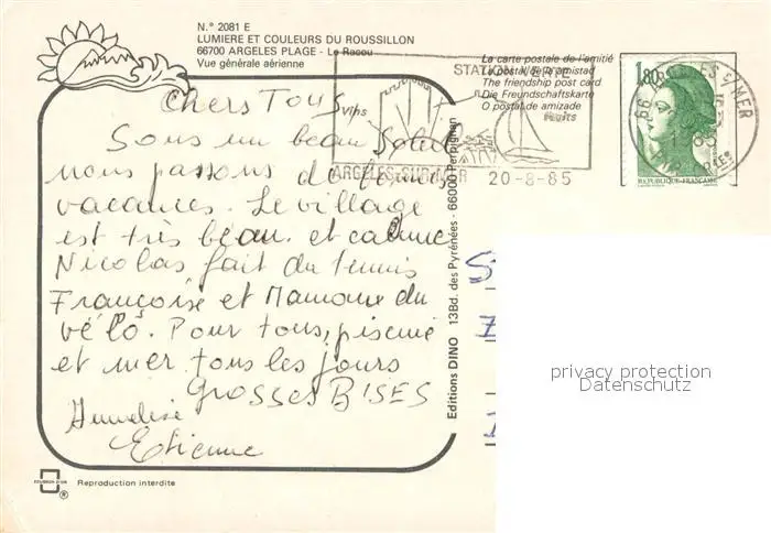 Argeles_Plage Vue aérienne Argeles_Plage postalisch gelaufen 1985 Erhaltung siehe scans [FriedD77] Frierer