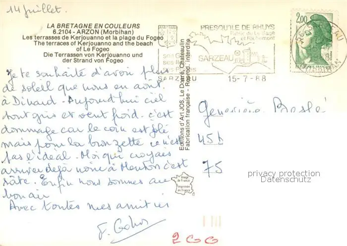 Arzon Terrasses de Kerjouanno Plage du Fogeo vue aérienne Arzon postalisch gelaufen 1988 Erhaltung siehe scans [FriedD77] Frierer