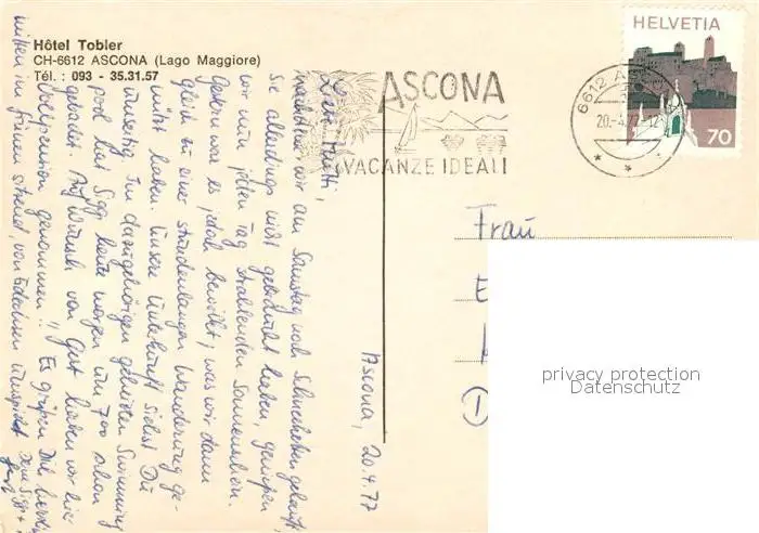 Ascona_TI Hotel Tobler Ascona_TI postalisch gelaufen 1977 Erhaltung siehe scans [NatalD47] NataID47
