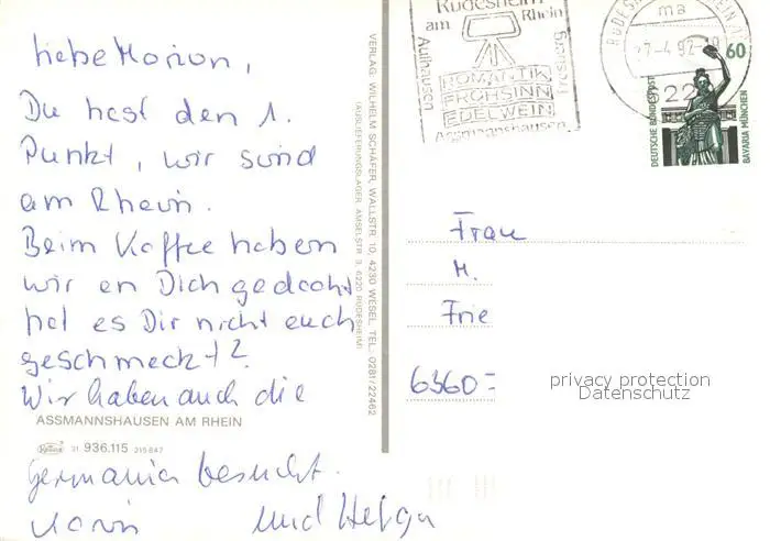 Assmannshausen Ortsansicht mit Kirche Rhein Assmannshausen postalisch gelaufen 1992 Erhaltung siehe scans [FriedD77] Frierer