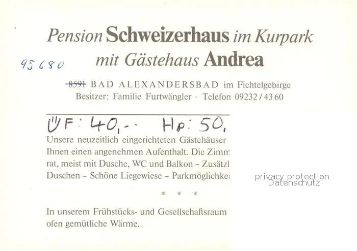 Bad_Alexandersbad Cafe Pension Furtwaengler Bad_Alexandersbad postalisch nicht gelaufen nach 1965 Werbekarte (keine Postkarte) Erhaltung siehe scans [FriedD77] Werbekarte (keine Postkarte) Frierer