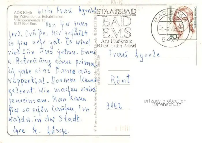 Bad_Ems AOK Klinik Bad_Ems postalisch gelaufen 1993 Erhaltung siehe scans [KathaD81] Kathoren