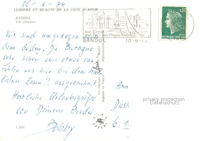 Bandol-sur-Mer Vue aerienne Bandol-sur-Mer postalisch gelaufen 1974 Erhaltung siehe scans [WerneD78] WernPID7