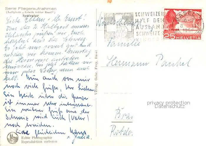 Basel_BS Fliegeraufnahme mit Spalentor Basel_BS postalisch gelaufen 1956 Erhaltung siehe scans [FriedD77] Frierer
