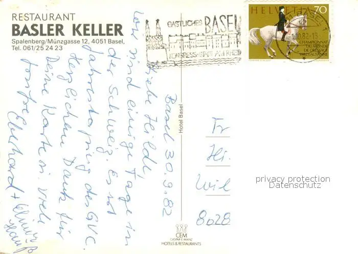 Basel_BS Restaurant Basler Keller Basel_BS postalisch gelaufen 1982 Erhaltung siehe scans [FriedD77] Frierer