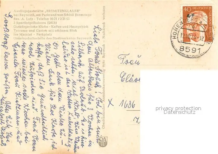 Bayreuth Ausflugsgaststaette Eremitenklause Kegelbahn Bayreuth postalisch gelaufen 1974 Erhaltung siehe scans [FriedD77] Frierer
