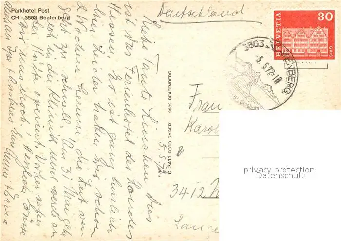 Beatenberg Parkhotel Post Beatenberg postalisch gelaufen 1972 Erhaltung siehe scans [FriedD77] Frierer