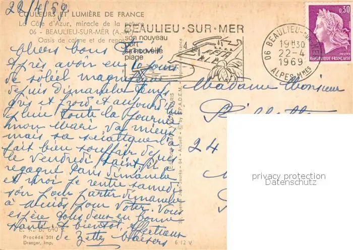 Beaulieu-sur-Mer Vue panoramique Beaulieu-sur-Mer postalisch gelaufen 1969 Erhaltung siehe scans [FriedD77] Frierer