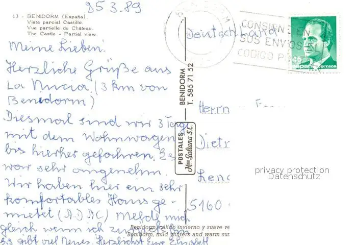 Benidorm Strand Schloss Benidorm postalisch gelaufen 1989 Erhaltung siehe scans [LiesaD40] LiesID40