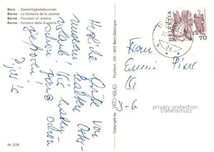 Bern_BE Gerechtigkeitsbrunnen Bern_BE postalisch gelaufen 1980 Erhaltung siehe scans [FriedD77] Frierer