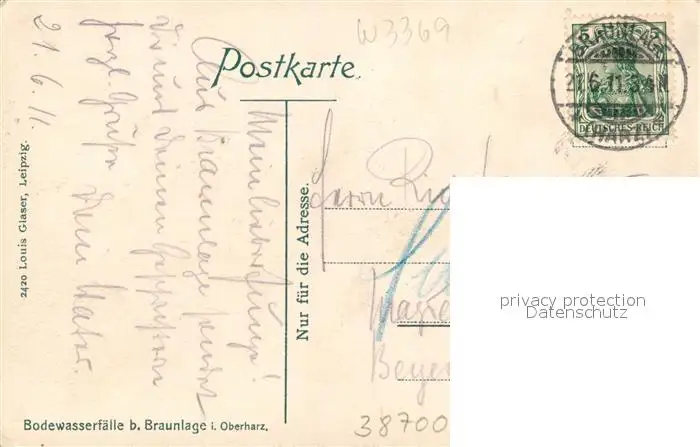 Braunlage Bodewasserfaelle Braunlage postalisch gelaufen 1911 Erhaltung siehe scans [WerneD78] WernPID7
