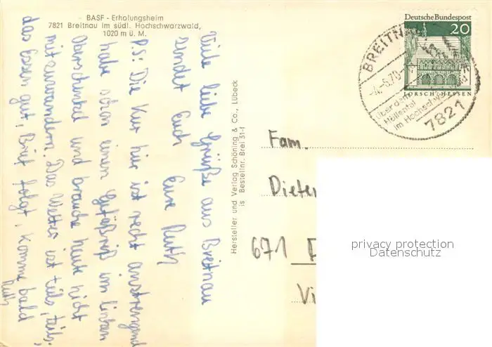 Breitnau BASF Erholungsheim Breitnau postalisch gelaufen 1970 Erhaltung siehe scans [WerneD78] WernPID7