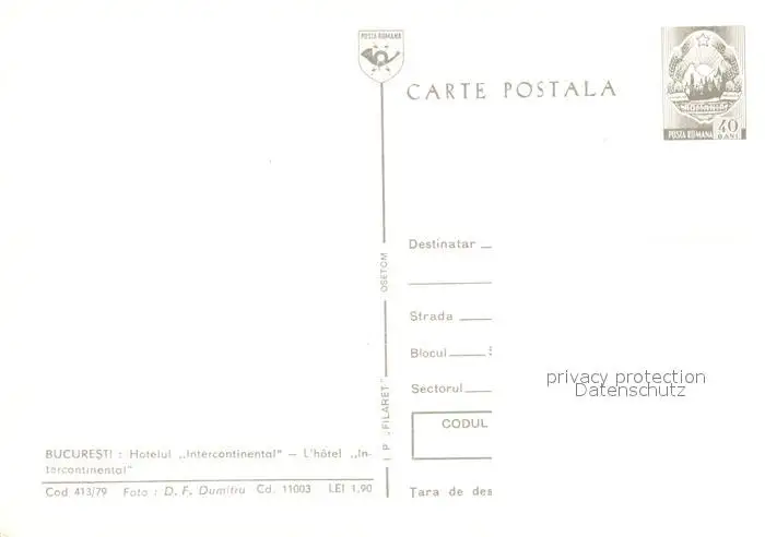 Bukarest Hotel Intercontinental Bukarest postalisch nicht gelaufen nach 1965 Erhaltung siehe scans [LiesaD40] LiesID40