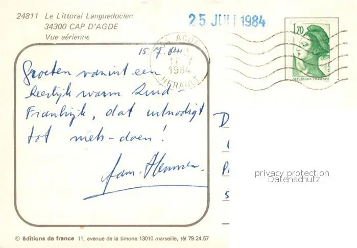 Cap-d_Agde Vue aerienne Cap-d_Agde postalisch gelaufen 1984 Erhaltung siehe scans [WerneD78] WernPID7