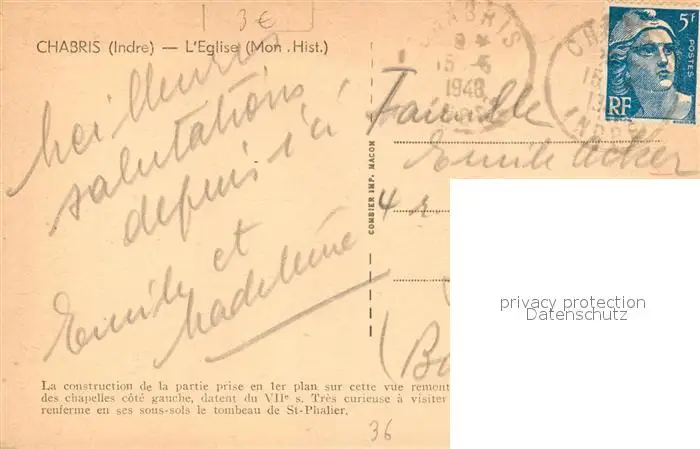 Chabris Eglise Chabris postalisch gelaufen 1948 Erhaltung siehe scans [LiesaD40] LiesID40