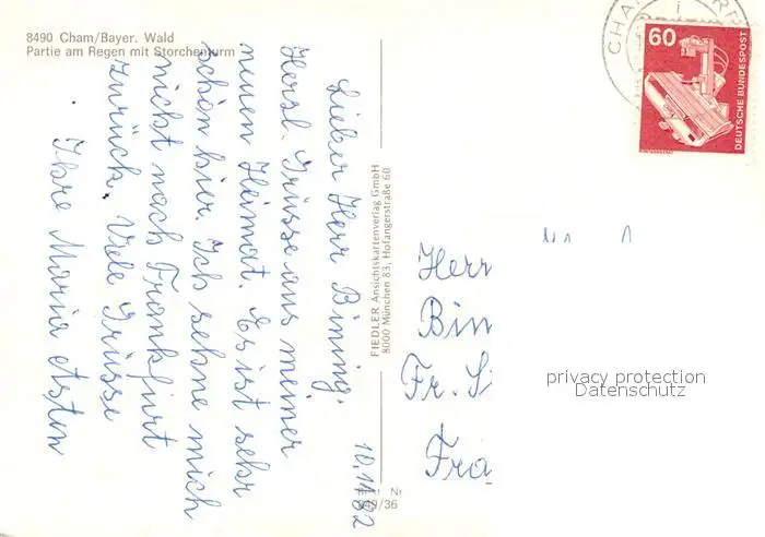 Cham_Oberpfalz Partie am Regen mit Storchenturm Cham Oberpfalz postalisch gelaufen 1982 Erhaltung siehe scans [FriedD77] Frierer