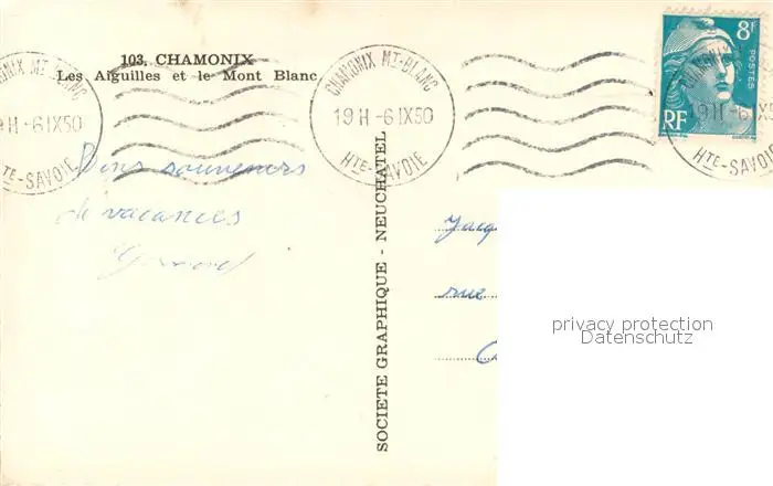 Chamonix Les Aiguilles et le Mont Blanc Chamonix postalisch gelaufen 1950 Erhaltung siehe scans [FriedD77] Frierer