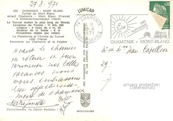 Chamonix Tunnel Mont Blanc Chamonix postalisch gelaufen 1971 Erhaltung siehe scans [KathaD81] Kathoren