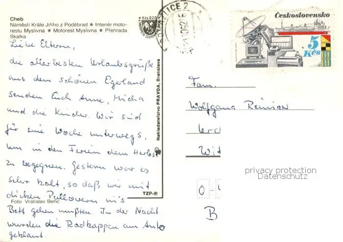Cheb_Eger Namesti Krale Jiriho z Podebrad Motorest Myslivna postalisch gelaufen 1992 Erhaltung siehe scans [FriedD77] Frierer