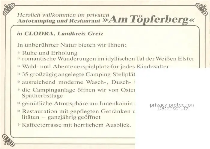 Clodra Restaurant Am Toepferberg Autocamping Clodra postalisch nicht gelaufen nach 1965 Werbekarte (keine Postkarte) Erhaltung siehe scans [FriedD77] Werbekarte (keine Postkarte) Frierer