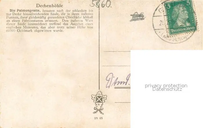 Dechenhoehle_Iserlohn Palmengrotte postalisch gelaufen 1921-1965 Erhaltung siehe scans [LiesaD40] LiesID40