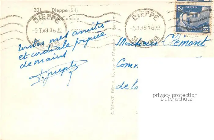 Dieppe_76 Le Square du Canada postalisch gelaufen 1949 Erhaltung siehe scans [WerneD78] WernPID7