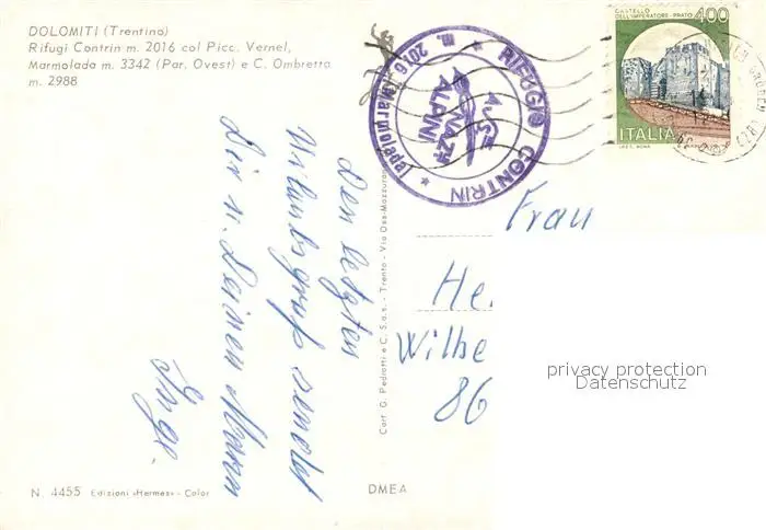Dolomiti Rifugi Contrin col Picco Vernel Marmolada Dolomiti postalisch gelaufen nach 1965 Erhaltung siehe scans [WerneD78] WernPID7