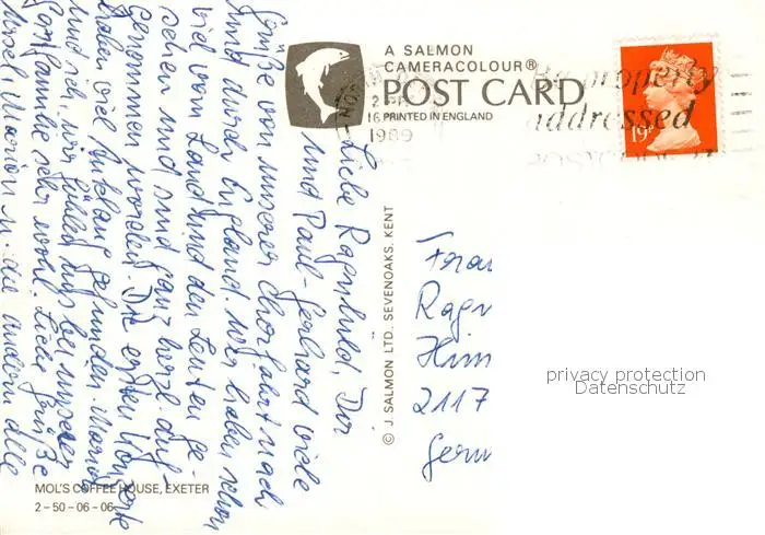 Exeter__UK Mols Coffee House postalisch gelaufen 1989 Erhaltung siehe scans [WerneD78] WernPID7