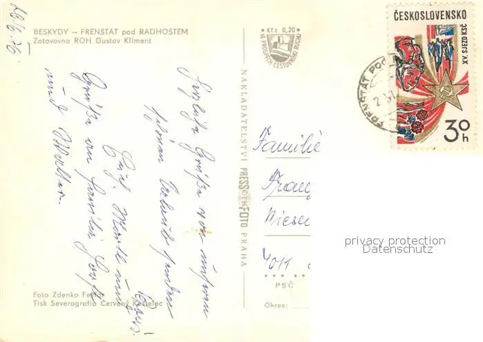Frenstat_pod_Radhostem ROH Gustav Kliment Frenstat_pod_Radhostem postalisch gelaufen nach 1965 Erhaltung siehe scans [KathaD81] Kathoren