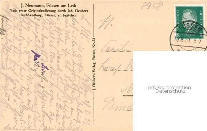 Fuessen_Allgaeu Schloss Lechpartie Radierung Fuessen Allgaeu postalisch gelaufen 1929 Erhaltung siehe scans [WerneD78] WernPID7
