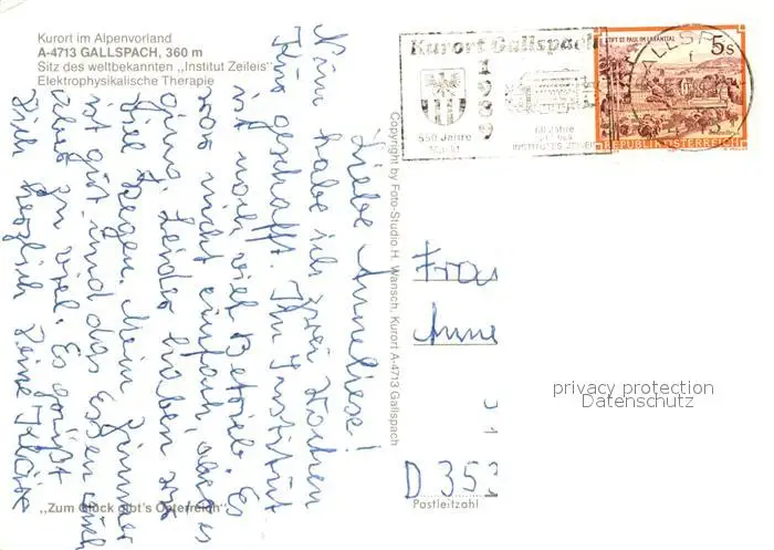 Gallspach Institut Zeileis Gallspach postalisch gelaufen 1989 Erhaltung siehe scans [LiesaD40] LiesID40