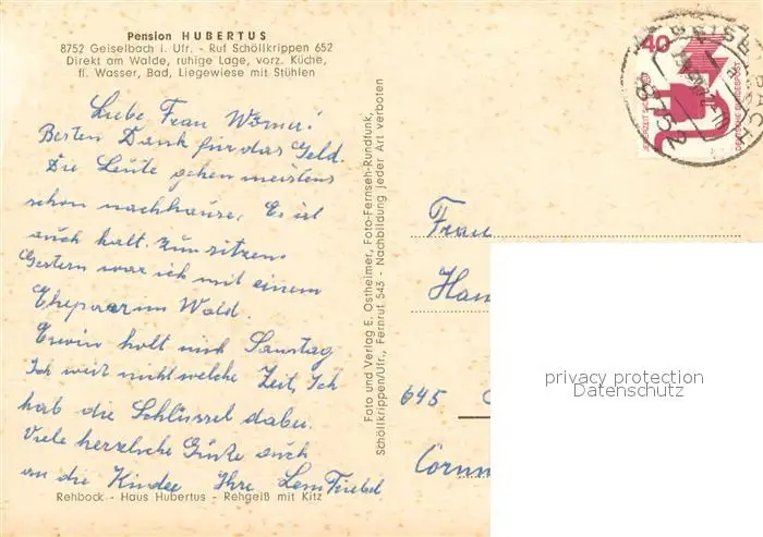 Geiselbach Gesamtansicht u. Pension Hubertus Rehe Geiselbach postalisch gelaufen 1972 Erhaltung siehe scans [LiesaD40] LiesID40