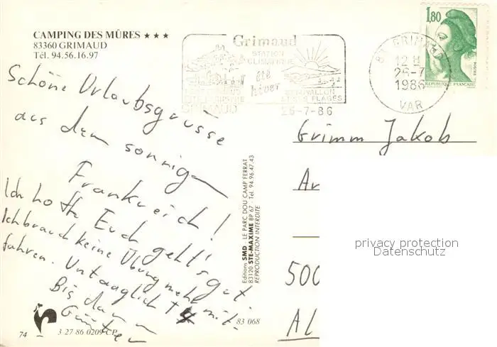 Grimaud_83 Camping des Mures postalisch gelaufen 1986 Erhaltung siehe scans [LiesaD40] LiesID40