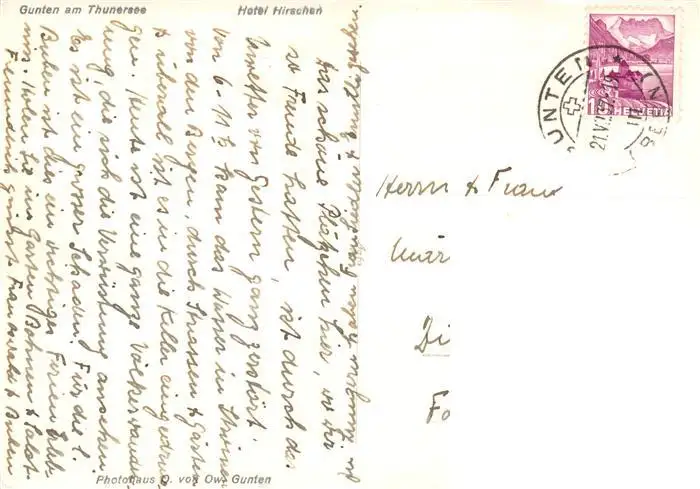 Gunten_Thunersee_BE Hotel Hirschen postalisch gelaufen 1921-1965 Erhaltung siehe scans [WerneD78] WernPID7