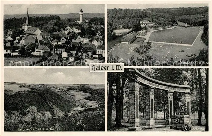 AK / Ansichtskarte Halver Ortsblick Strandbad Herpine Halvertal Ehrenmal Halver