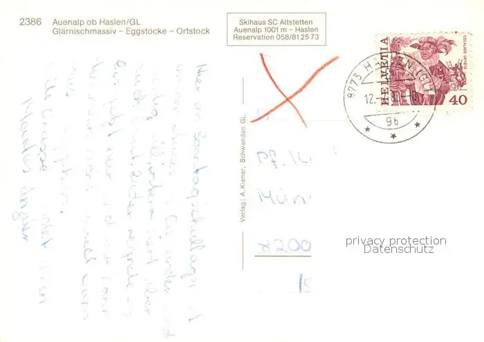 Haslen_GL Auenalp Skihaus SC Altstetten Haslen_GL postalisch gelaufen 1980 Erhaltung siehe scans [LiesaD40] LiesID40