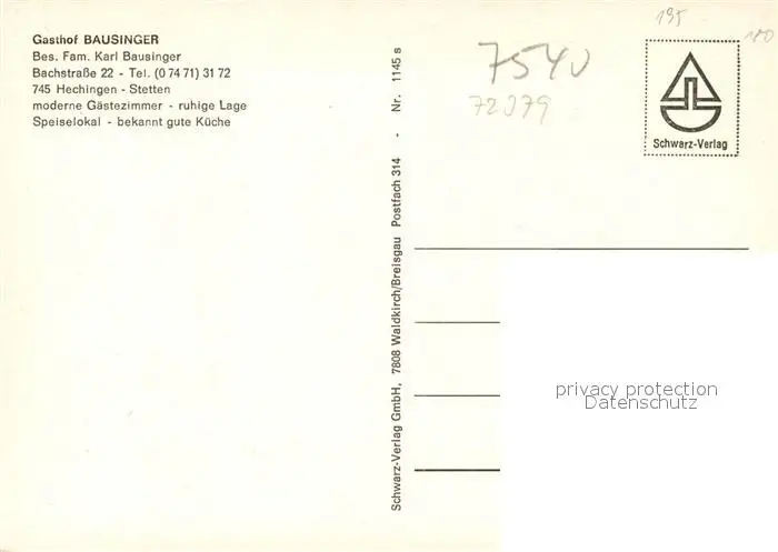 Hechingen Gasthaus Bausinger Hechingen postalisch nicht gelaufen nach 1965 Erhaltung siehe scans [WerneD78] WernPID7