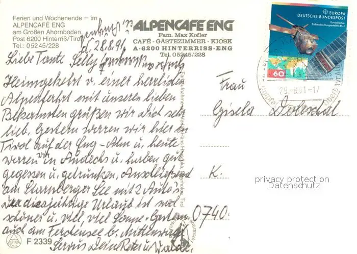 Hinterriss_Tirol Alpencafe Eng Hinterriss Tirol postalisch gelaufen 1991 Erhaltung siehe scans [WerneD78] WernPID7