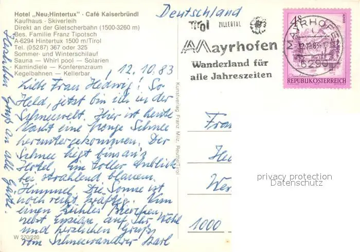 Hintertux_Zillertal Hotel Neu-Hintertux Caf? Kaiserbr?ndl Hintertux_Zillertal postalisch gelaufen 1983 Erhaltung siehe scans [LiesaD40] LiesID40
