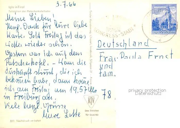 Igls_Tirol Talstation der Patscherkofelbahn Igls_Tirol postalisch gelaufen 1966 Erhaltung siehe scans [FriedD77] Frierer