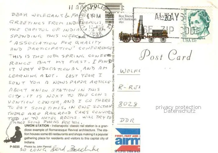 Indianapolis Union Station Rail Station postalisch gelaufen 1988 Erhaltung siehe scans [FriedD77] Frierer