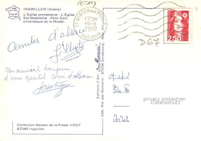 Ingwiller Eglise Ingwiller postalisch gelaufen 1992 Erhaltung siehe scans [LiesaD40] LiesID40