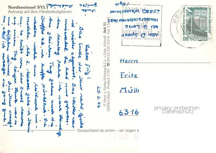Insel_Sylt Autozug Hindenburgdamm Insel_Sylt postalisch gelaufen 1986 Erhaltung siehe scans [KathaD81] Kathoren