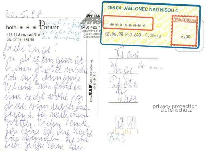 Janov_nad_Nisou Hotel Premier Landschaftspanorama Janov_nad_Nisou postalisch gelaufen 1998 Erhaltung siehe scans [FriedD77] Frierer