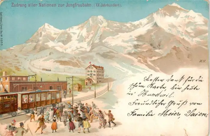 Jungfrau_BE Zudrang aller Nationen zur Jungfraubahn Jungfrau BE postalisch gelaufen 1902 Erhaltung siehe scans [FriedD77] Frierer