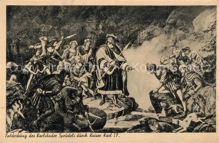 AK / Ansichtskarte Karlsbad_Eger Entdeckung des Karlsbader Sprudels durch Kaiser Karl IV. Karlsbad_Eger