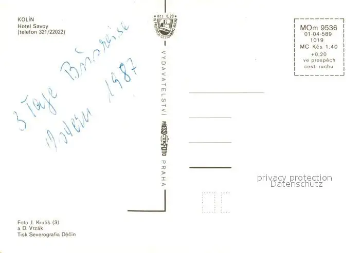 Kolin Hotel Savoy Kolin postalisch nicht gelaufen 1987 Erhaltung siehe scans [LiesaD40] LiesID40
